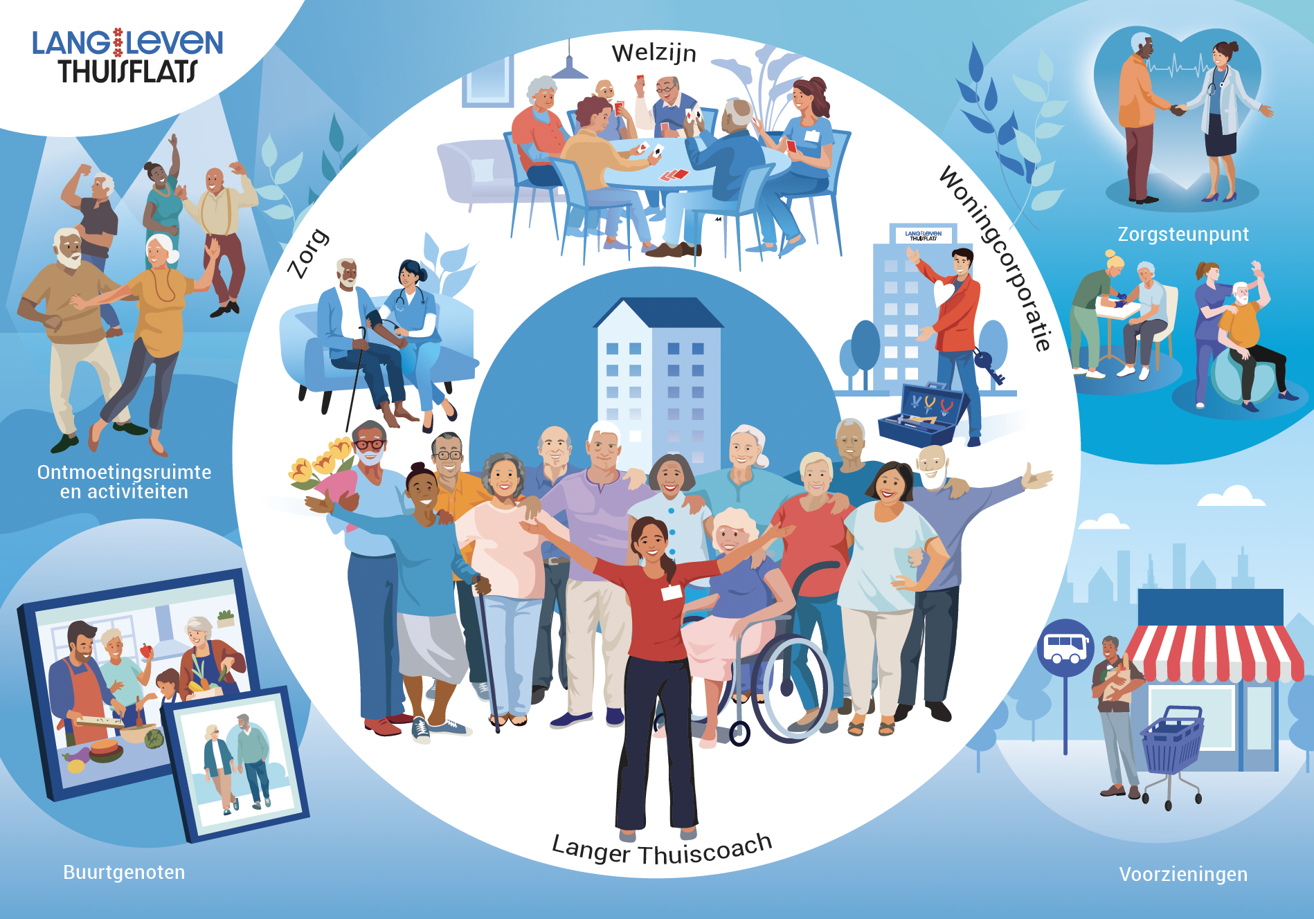 Om duidelijk te maken wat Lang Leven Thuisflats zijn, is een praatplaat ontwikkeld. Deze visuele weergave laat in één oogopslag de belangrijkste elementen van deze woonvorm zien en toont hoe verschillende partijen samenwerken zodat ouderen langer zelfstandig thuis kunnen blijven wonen.